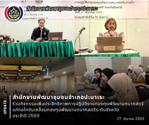 วันที่ 27 มีนาคม 2569 สำนักงานพัฒนาชุมชนอำเภอปะนาเระ โดยนางสาวปรียานุช มาทน พัฒนาการอำเภอปะนาเระ เป็นวิทยากรให้ความรู้ในหัวข้อ“การสร้างสื่อประชาสัมพันธ์ด้วยเครื่องมือ AI และการเพิ่มช่องทางการตลาด Online” โดยมีวัตถุประสงค์เพื่อสร้างความรู้ความเข้าใจ ในการดำเนินงานของกองทุนพัฒนาบทบาทสตรีและเพิ่มทักษะ การปฏิบัติงานกองทุนพัฒนาบทบาทสตรีฯ โดยมีนายธีรวิทย์ กู้เกียรติ พัฒนาการจังหวัดปัตตานี เป็นประธานในโครงการเพิ่มประสิทธิภาพการปฏิบัติงานกองทุนพัฒนาบทบาทสตรีแก่กลไกขับเคลื่อนกองทุนพัฒนาบทบาทสตรีระดับจังหวัด ประจำปี 2569 กลุ่มเป้าหมาย จำนวน 52 ราย ณ ห้องประชุมศรีนครี ชั้น 2 โรงแรมเซาท์เทิร์นวิว ปัตตานี จังหวัดปัตตานี
