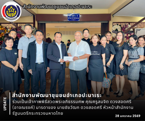 วันที่ 28 มกราคม 2569 สำนักงานพัฒนาชุมชนอำเภอปะนาเระ นางสาวปรียานุช มาทน พัฒนาการอำเภอปะนาเระ พร้อมด้วยเจ้าหน้าที่พัฒนาชุมชน ร่วมพิธีสวดพระอภิธรรมศพ คุณครูสมจิต ดวงสอดศรี (อาจณรงค์) มารดาของ นายชัยวัฒก ดวงสอดศรี หัวหน้าสำนักงานรัฐมนตรีกระทรวงมหาดไทย โดยมี นายจอน สุกป่าน นายอำเภอปะนาเระ/ ผอ.ศปก.อ.ปะนาเระ พร้อมด้วย นายไพโรจน์ เกิดแสงสุริยงค์ ปลัดอำเภอหัวหน้ากลุ่มงานบริหารงานปกครอง หัวหน้าส่วนราชการ ข้าราชการ บุคลากร และกำนัน ผู้ใหญ่บ้านอำเภอปะนาเระ ณ วัดนพวงศาราม (วัดใหม่) อำเภอเมือง จังหวัดปัตตานี