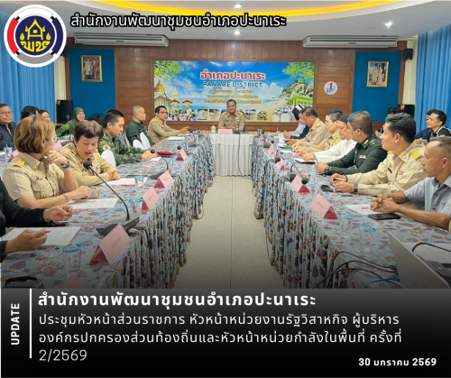 วันศุกร์ ที่ 30 มกราคม 2569 นางสาวปรียานุช มาทน พัฒนาการอำเภอปะนาเระ เข้าร่วมประชุมหัวหน้าส่วนราชการ เพื่อขับเคลื่อนการดำเนินงานของส่วนราชการในพื้นที่ ชี้แจงข้อราชการต่างๆ การขับเคลื่อนการปฏิบัติงานตามนโยบาย ข้อสั่งการของจังหวัด กรมการปกครอง กระทรวงมหาดไทย และนโยบายรัฐบาล เพื่อให้เกิดประโยชน์กับทางราชการและประชาชนในพื้นที่ โดยมีนายจอน สุกป่าน นายอำเภอปะนาเระ/ผอ.ศปก.อ.ปะนาเระ พร้อมด้วยหัวหน้าส่วนราชการ, หัวหน้าหน่วยกำลัง, หัวหน้าหน่วยงานรัฐวิสาหกิจ, ผู้บริหารสถานศึกษา, ปลัดอำเภอ, เสมียนตราอำเภอ และผู้บริหารองค์กรปกครองส่วนท้องถิ่น เข้าร่วมประชุมฯ ครั้งนี้ ณ ห้องประชุมดงตาล ชั้น 2 อำเภอปะนาเระ ที่ว่าการอำเภอปะนาเระ จังหวัดปัตตานี