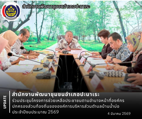 วันที่ 4 มีนาคม 2569 สำนักงานพัฒนาชุมชนอำเภอปะนาเระ โดยนางสาวปรียานุช มาทน พัฒนาการอำเภอปะนาเระ มอบหมายให้ นางอทิตยา โต๊ะปาลัส พัฒนากรผู้ประสานงานตำบลบ้านน้ำบ่อ ร่วมประชุมโครงการช่วยเหลือประชาชนตามอำนาจหน้าที่องค์กรปกครองส่วนท้องถิ่นขององค์การบริหารส่วนตำบลบ้านน้ำบ่อ ประจำปีงบประมาณ 2569 เพื่อพิจารณาความช่วยเหลือประชาชนที่ได้รับความเดือดร้อนหรือไม่สามารถช่วยเหลือตนเองได้ในการดำรงชีพ ให้สามารถดำรงชีพได้อย่างปกติสุข โดยมีนายฟาญัร ศรีวรรณยศ ปลัดอำเภอผู้เป็นหัวหน้าประจำตำบลบ้านน้ำบ่อ, นางหนึ่งฤทัย ชุมคง ท้องถิ่นอำเภอปะนาเระ , ปลัดองค์การบริหารส่วนตำบลบ้านน้ำบ่อ และคณะกรรมการช่วยเหลือประชาชนขององค์การบริหารส่วนตำบลบ้านน้ำบ่อ ร่วมประชุมฯ ณ ห้องประชุมองค์การบริหารส่วนตำบลบ้านน้ำบ่อ อำเภอปะนาเระ จังหวัดปัตตานี