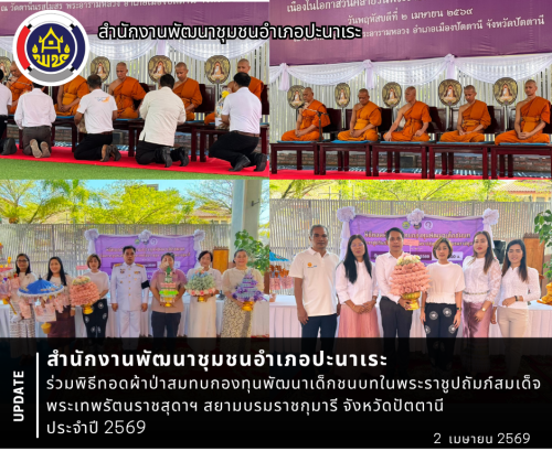 วันที่ 2 เมษายน 2569 สำนักงานพัฒนาชุมชนอำเภอปะนาเระ โดยนายจอน สุกป่าน นายอำเภอปะนาเระ/ผอ.ศปก.อ.ปะนาเระ มอบหมายให้ นายไพโรจน์ เกิดแสงสุริยงค์ ปลัดอำเภอหัวหน้ากลุ่มงานบริหารงานปกครอง พร้อมด้วย นางสาวปรียานุช มาทน พัฒนาการอำเภอปะนาเระ และเจ้าหน้าที่พัฒนาชุมชน ร่วมพิธีทอดผ้าป่าสมทบกองทุนพัฒนาเด็กชนบท ในพระราชูปถัมภ์สมเด็จพระเทพรัตนราชสุดาฯ สยามบรมราชกุมารี จังหวัดปัตตานี ประจำปี 2569 เพื่อให้เด็กชนบทได้รับการพัฒนาอย่างทั่วถึงฯ โดยมี นายสนั่น สนธิเมือง รองผู้ว่าราชการจังหวัดปัตตานี เป็นประธานทอดผ้าป่า พร้อมด้วยนายธีรวิทย์ กู้เกียรติ พัฒนาการจังหวัดปัตตานี ผู้อำนวยการกลุ่มงาน/พัฒนาการอำเภอ หรือผู้แทน/นักวิชาการพัฒนาชุมชน/พนักงานราชการ/และบุคคลากรในสังกัดกรมการพัฒนาชุมชนจังหวัดปัตตานี เข้าร่วมฯ ครั้งนี้ ณ วัดตานีนรสโมสร ตำบลอาเนาะรู อำเภอเมืองปัตตานี จังหวัดปัตตานี