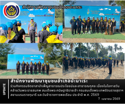 วันที่ 7 เมษายน 2569 สำนักงานพัฒนาชุมชนอำเภอปะนาเระ โดยนางสาวปรียานุช มาทน พัฒนาการอำเภอปะนาเระ พร้อมด้วยเจ้าหน้าที่พัฒนาชุมชน ร่วมกิจกรรมจิตอาสาบำเพ็ญสาธารณประโยชน์และสาธารณกุศล เนื่องในโอกาสวันคล้ายวันพระราชสมภพ สมเด็จพระกนิษฐาธิราชเจ้า กรมสมเด็จพระเทพรัตนราชสุดาฯ สยามบรมราชกุมารี และวันข้าราชการพลเรือน ประจำปี พ.ศ. 2569 โดยนายจอน สุกป่าน นายอำเภอปะนาเระ/ผอ.ศปก.อ.ปะนาเระ มอบหมายให้ นายไพโรจน์ เกิดแสงสุริยงค์ ปลัดอำเภอหัวหน้ากลุ่มงานบริหารงานปกครอง เป็นประธานกิจกรรมจิตอาสาบำเพ็ญสาธารณประโยชน์และสาธารณกุศลฯ โดยมี ส่วนราชการในพื้นที่ กำนัน ผู้ใหญ่บ้าน ผู้ช่วยผู้ใหญ่บ้าน สารวัตรกำนัน หน่วยทหาร ร้อยทพ.๔๒๑๕ , บัณฑิตอาสาฯ อส.และประชาชนจิตอาสา ตำบลปะนาเระ ณ บึงปีกยาว หมู่ที่ 4 บ้านคลองต่ำ ตำบลปะนาเระ อำเภอปะนาเระ จังหวัดปัตตานี